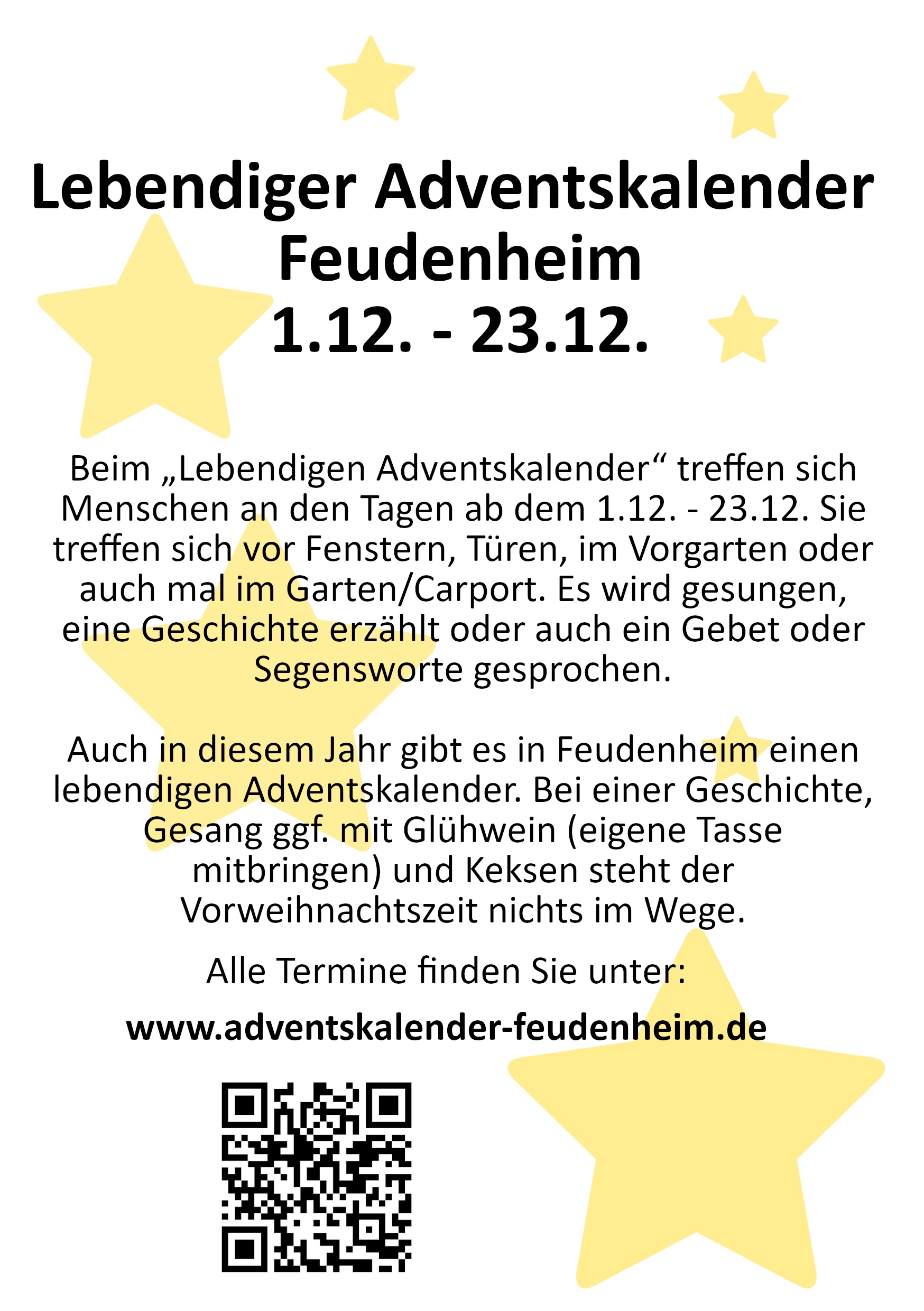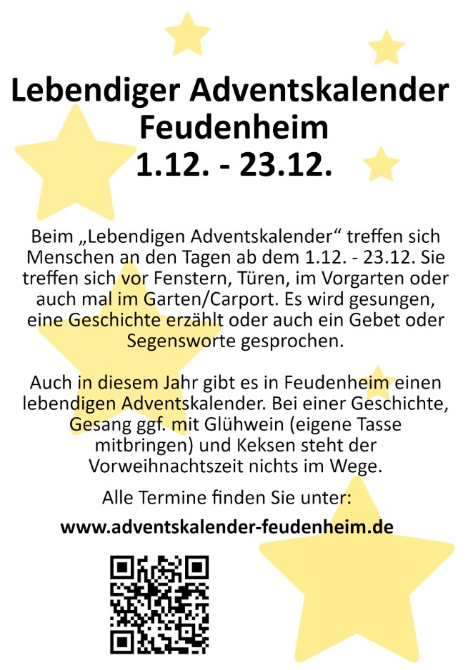 Der lebendige Adventskalender ist in jedem Jahr eine Reihe von gemeinschaftlichen Veranstaltungen in Feudenheim vom 01. bis zum 23. Dezember. Man trifft sich täglich an wechselnden Orten vor geschmückten Fenstern, Garagen oder in einem Garten oder einem Geschäft. Es wird gesungen, gelesen, gesprochen, gegessen, gelacht, getrunken. Schauen Sie doch gerne vorbei…