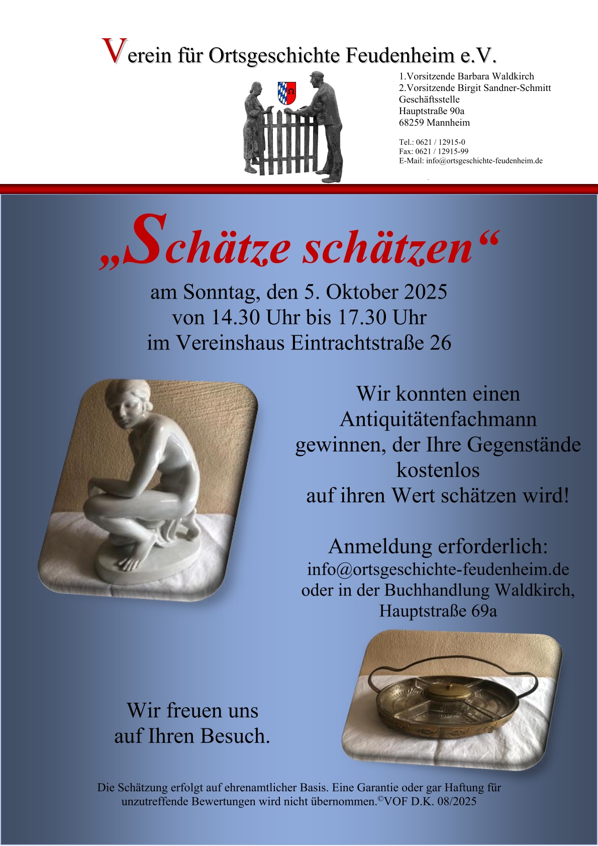 An diesem Tag haben wir wieder etwas Besonderes für Sie organisiert. Wir konnten einen Antiquitätenfachmann gewinnen, der Ihre Gegenstände kostenlos auf ihren Wert schätzen wird! Für Schätzungen ist eine Anmeldung erforderlich: info@ortsgeschichte-feudenheim.de oder in der Buchhandlung Waldkirch, Hauptstraße 69a.