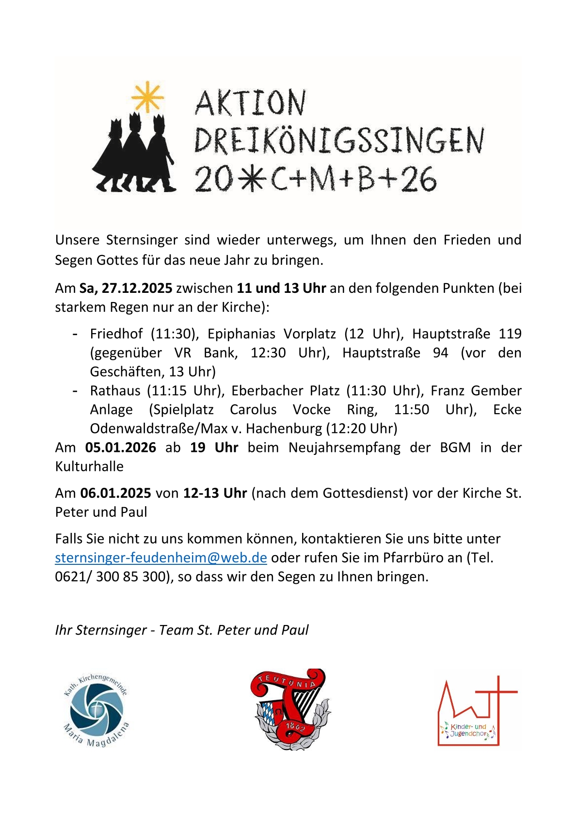 Unsere Sternsinger sind wieder unterwegs, um Ihnen den Frieden und Segen Gottes für das neue Jahr zu bringen. Im Flyer finden Sie alle Termine: