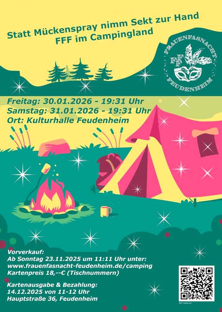 Unter dem Motto „Statt Mückenspray nimm Sekt zur Hand – FFF im Campingland“ freuen wir uns auf unsere Sitzungen im kommenden Jahr am 30 & 31.01.2026 in der Kulturhalle Feudenheim.