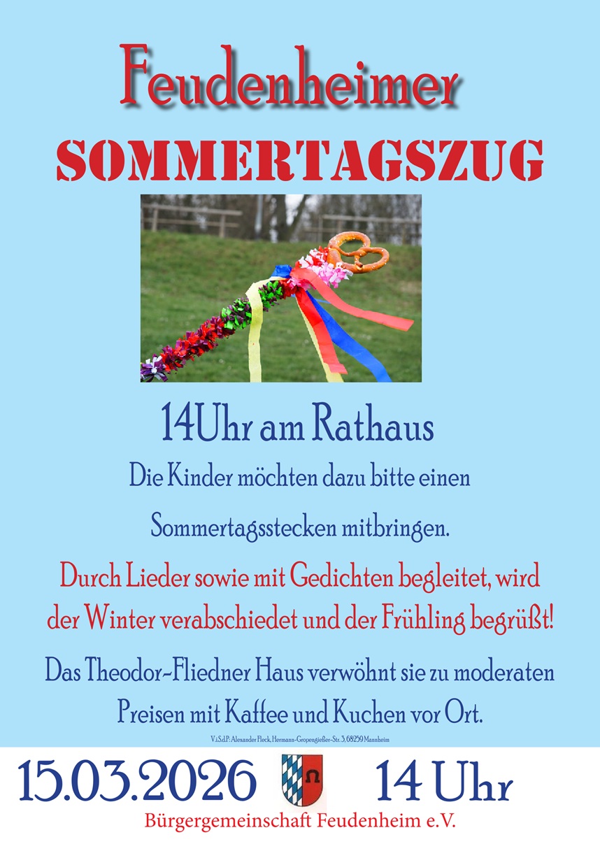Die Bürgergemeinschaft Feudenheim e.V. lädt ein zum Sommertagszug am Sonntag, den 15. März 2026.