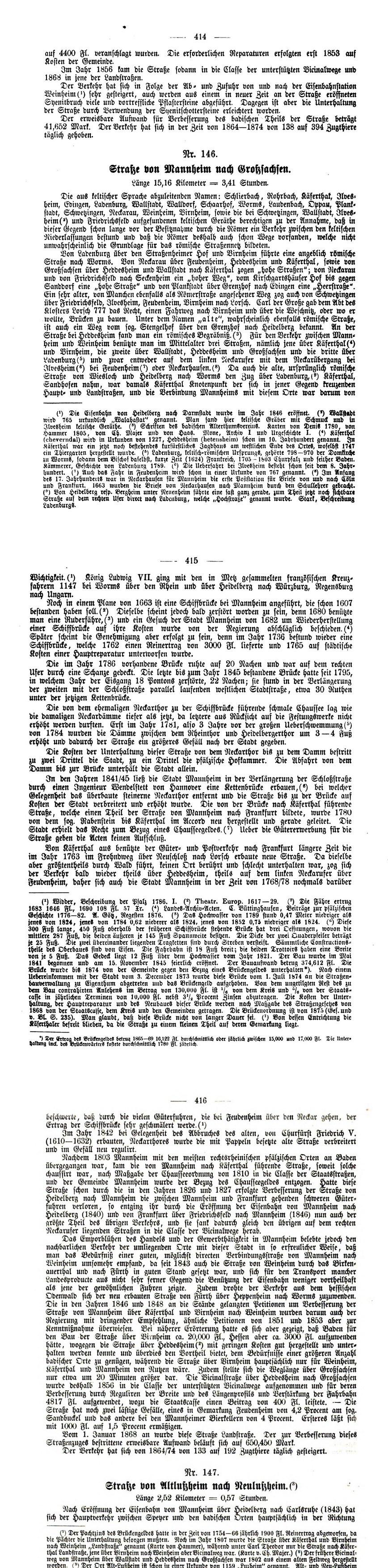 Baer hebt auch die Bedeutung des Weges über die Fähre bei Feudenheim hervor: „… daher sich auch die Stadt Mannheim in der Zeit von 1768/78 nochmals darüber beschwerte, daß durch die vielen Güterfuhren, die bei Feudenheim über den Neckar gehen, der Ertrag der Schiffbrücke (Anm. d. Redaktion: es gab eine Schiffsbrücke über den Neckar, die man aber nur über die enge Stadt erreichen konnte und wo zudem verschiedene Zölle (Stadttor-, Brückenzoll) erhoben wurden. Die Fähre bei Feudenheim war damals verkehrstechnisch besser gelegen und finanziell günstiger.) sehr geschmälert werde.“