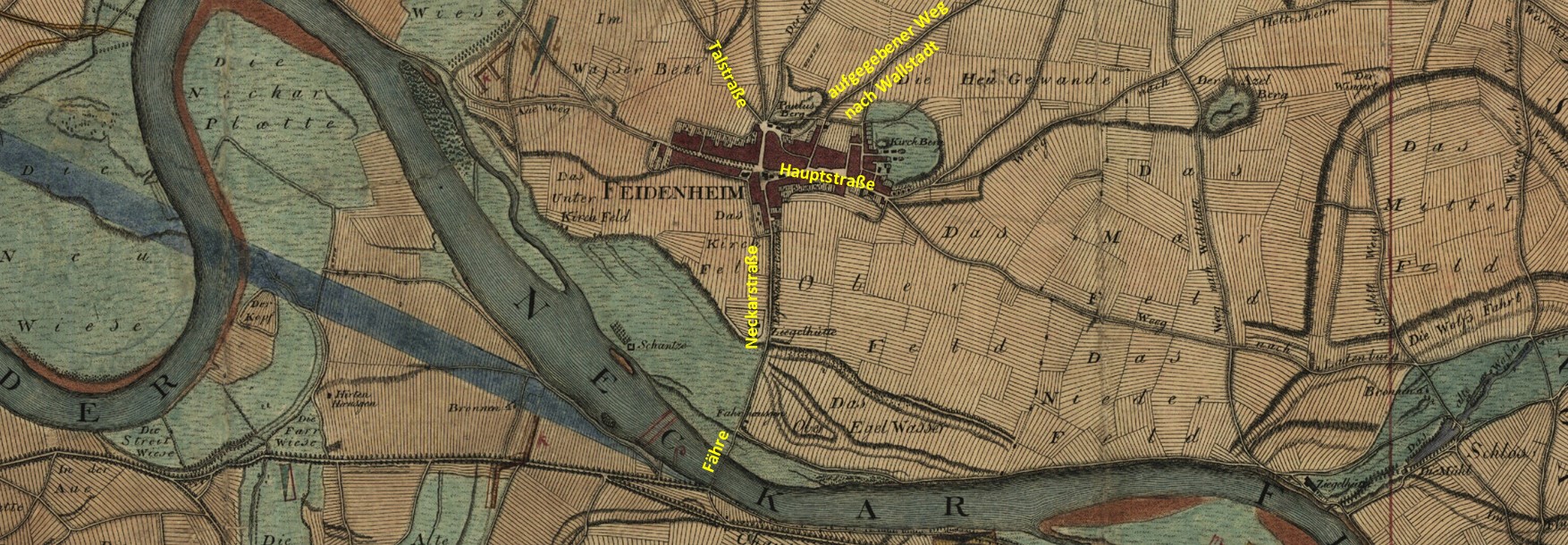 In der folgenden Karte von 1780 von Ferdinand Denis sieht man in Feudenheim die noch weitestgehend unbebauten Paulus- und Kirchberg. Die Neckarstraße hieß damals noch Egelwasser Gasse, die Talstraße noch Käfertaler Straße und die Hauptstraße noch Mannheimer Straße. Dies waren die Straßen, über die sich die Warenströme international verteilten. Wo sich heute Neckarstraße und Hauptstraße treffen, befand sich der Abzweig über Heddesheim nach Großsachsen; an dem heute sehr ruhig gelegenen Platz an Talstraße, Ziethenstraße, Weiherstraße, Eichbaumstraße und Paulusbergstraße befand sich bis ins 19. Jahrhundert der Verteiler über Käfertal oder Wallstadt nach Norden. An diesem Platz gab es über den Paulusberg eine direkte Straße nach Wallstadt, die mit der Bebauung des Paulus- und Kirchbergs aufgegeben worden ist. In unmittelbarer Nähe gab es bis vor kurzem noch Gaststätten wie das „Eichbaum“, das „Windeck“ und die Gaststätte am Eck Ziethen-/Talstraße: